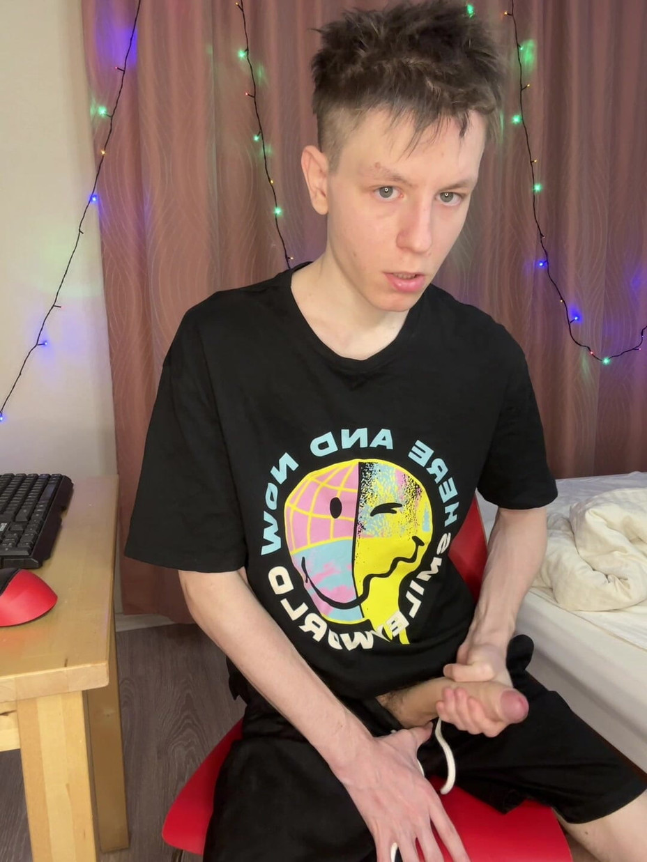 I’m an 18-year-old skinny twink with a massive young cock that barely fits in my hand. Watch this amateur twink strip totally naked. Grab that big cock and start a hot handjob. Slow strokes from the base up to the shiny head. Then faster and faster till the veins bulge and my balls slap against my thigh. My abs flex tight. My back arches. And boom-huge gay cumshot! Thick ropes of cum blast across my chest. Drip down my abs. And I milk out the last drops onto my fingers. Homemade solo from a cute gay boy who knows how to edge himself to explosion.