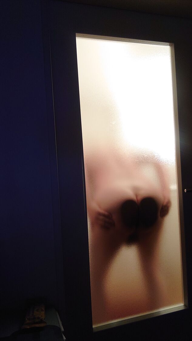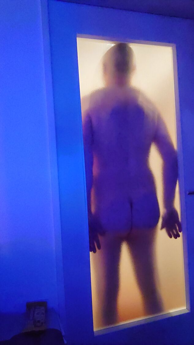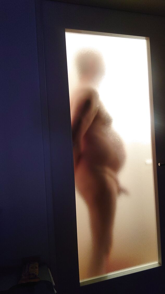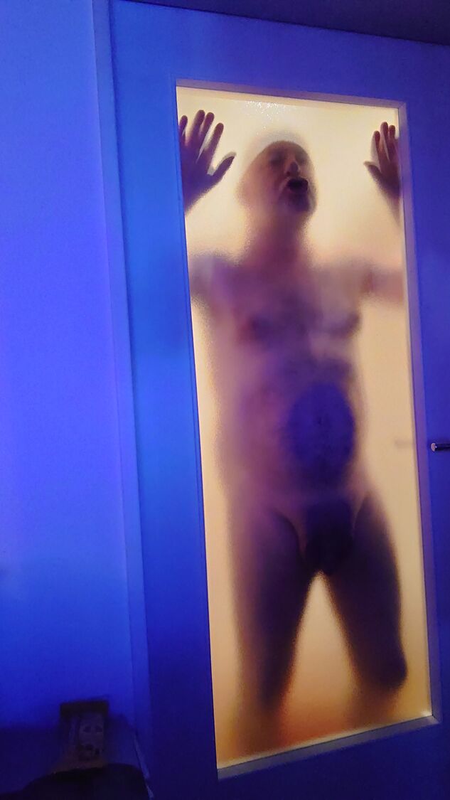 Naked fun at the glass door🤩😘🥰😍At home in the apartment it is warm and the light behind the glass door in the hallway lets me have a lot of fun with shadows with my naked chubby body.