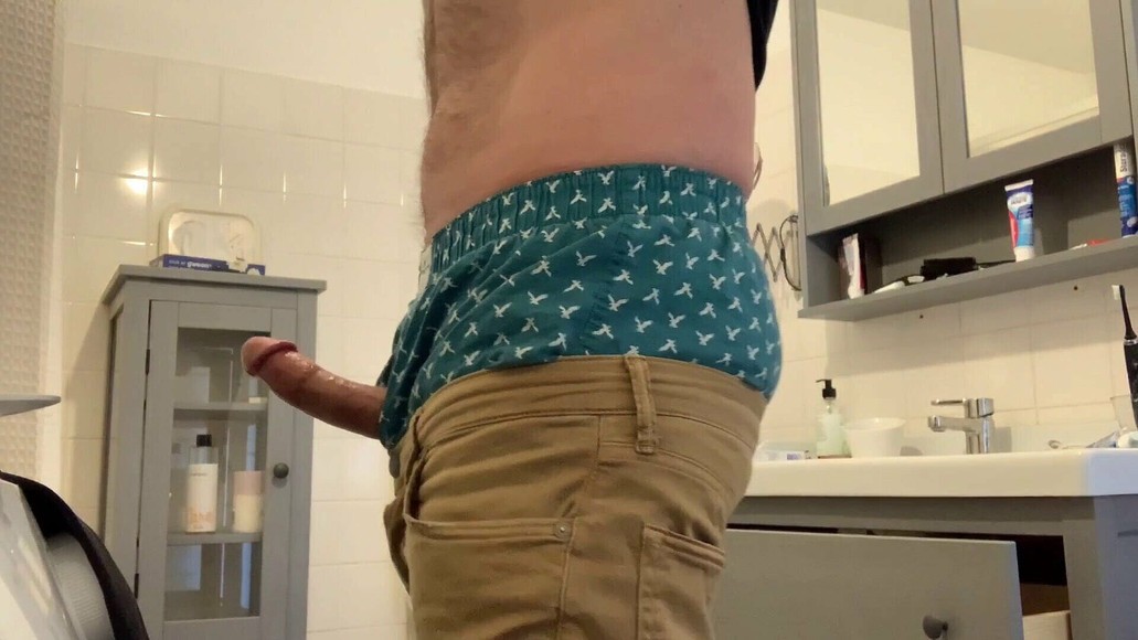 Jerking off my super hard, stiff, throbbing cock and cumming in the bathroom. Sagging in my American Eagle boxers too. I was super horny and hard so decided to rub one out in the bathroom.