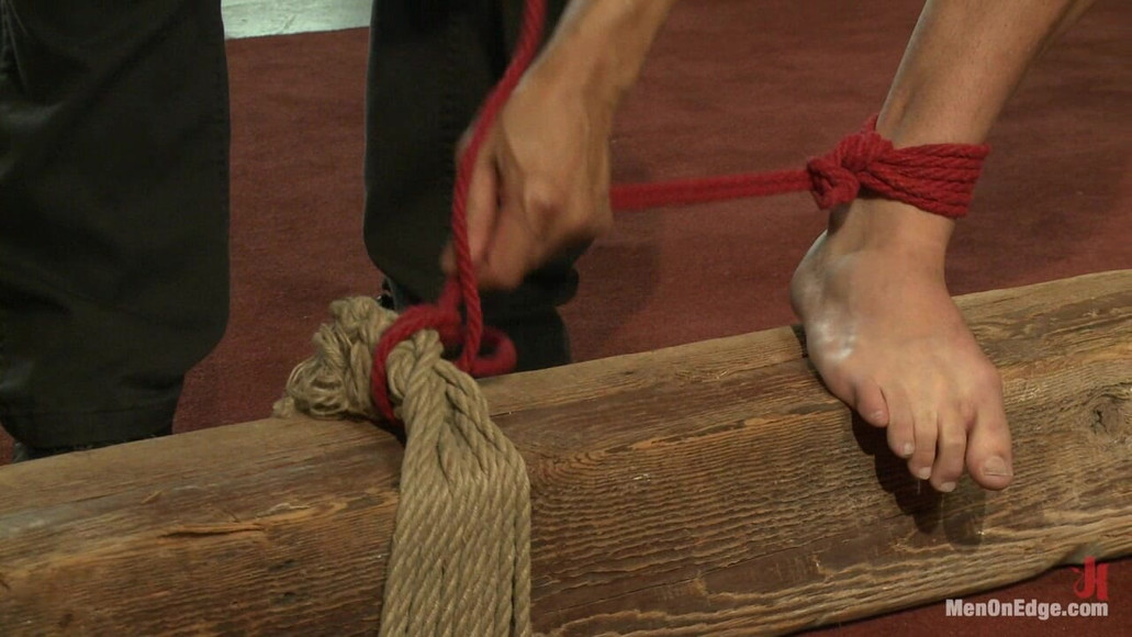 Mike de Marko comes to Men on Edge eager to further his experience with bondage. We tie him to the wall and rip his pants off to reveal his huge cock. Teasing it until it throbs we take it out of his briefs and stroke it until he’s about to cum. With Mike’s arms high in the air he’s flogged and jacked off nearly to the point of being overwhelmed. We suspend him and continue the flogging and cock stroking only to deny his orgasm again and again. Finally, tied to a bed we throw his legs over head and fuck his ass with a vibrator while stroking him. He loses control and cums all over himself from the intense sensation.