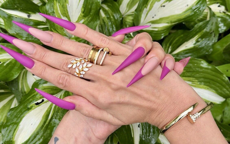 New purple color Long nails, sharp stilettos are close ups in the garden with flowers. Claws. Palms wide and flexable long fingers. Long fingers and hands fetish too. Jewelry Fetish.