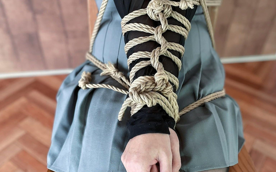 A woman tied to a chair with rope. She struggles to free herself from the ropes when no one else is around. - See-through top, mini skirt and black pantyhose - Tightly tied to the chair with rope Documentary situation of rope escape
