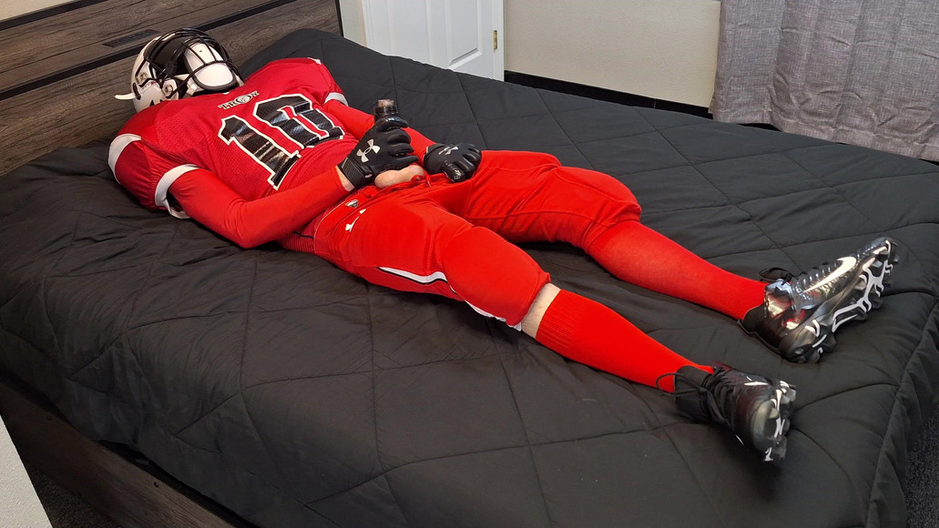 After spending most of the day in full football gear, coach was generous an gave me permission to cum. But under specific rules that I be in a rubber hood under my helmet, insert my smelly cup under my helmet for me to smell an could only cum using the teams fleshlight, no telling how many loads are in it but it was well lubed up for me to use, didn't take too long before I shot a good load on my gear for coach!